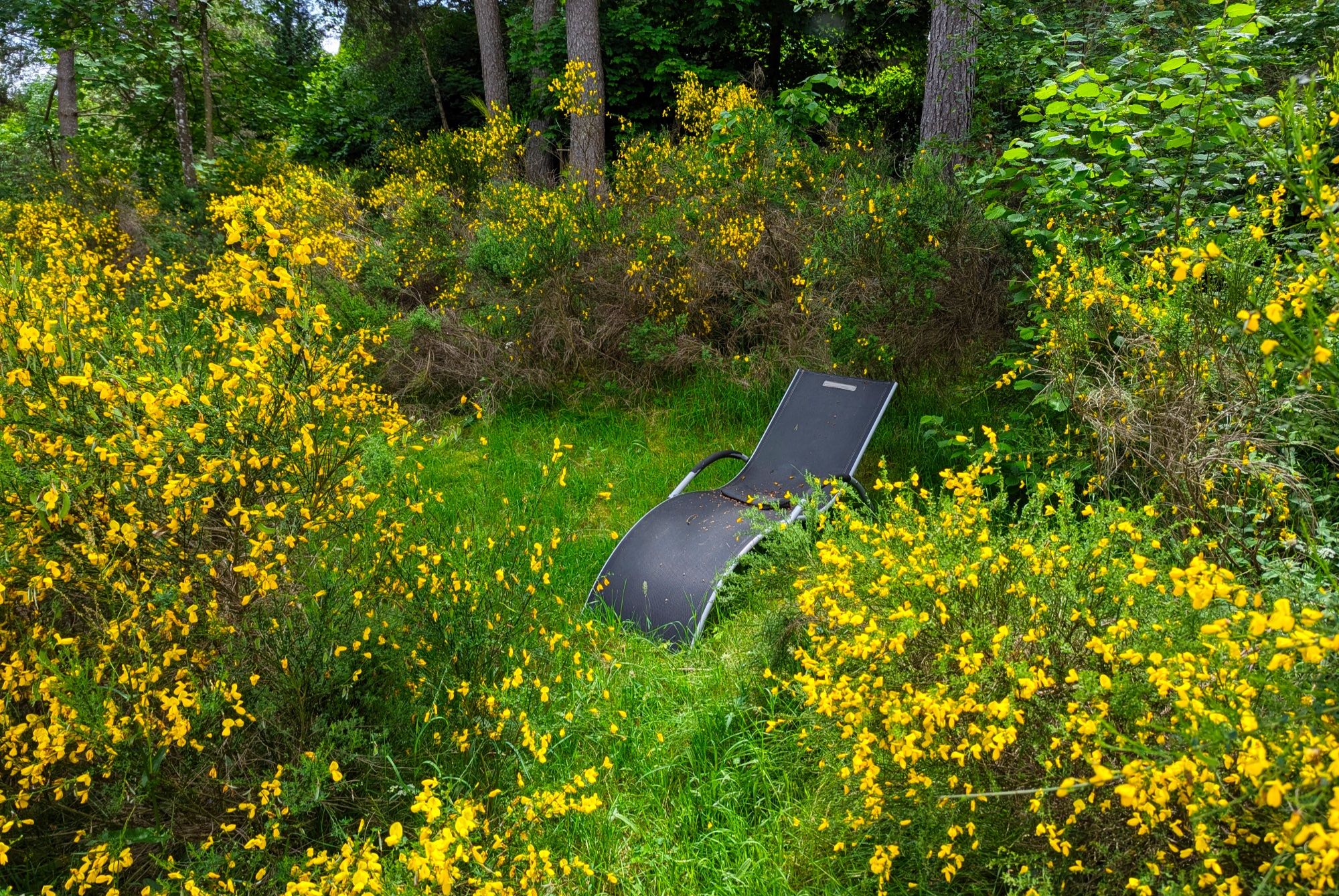 Un chemin est tracé à la faux au sein du parc, il dessert les différents lieux : un coin détente avec une chaise longue, le coin des écureuils ( chaises pour enfants sous un grand sapin), l'étendoir, l'espace hamacs, le massif de framboisiers, un second coin détente avec chaise longue , le terrain de pétanque et retour sur la partie plane où est situé le filet de badminton.