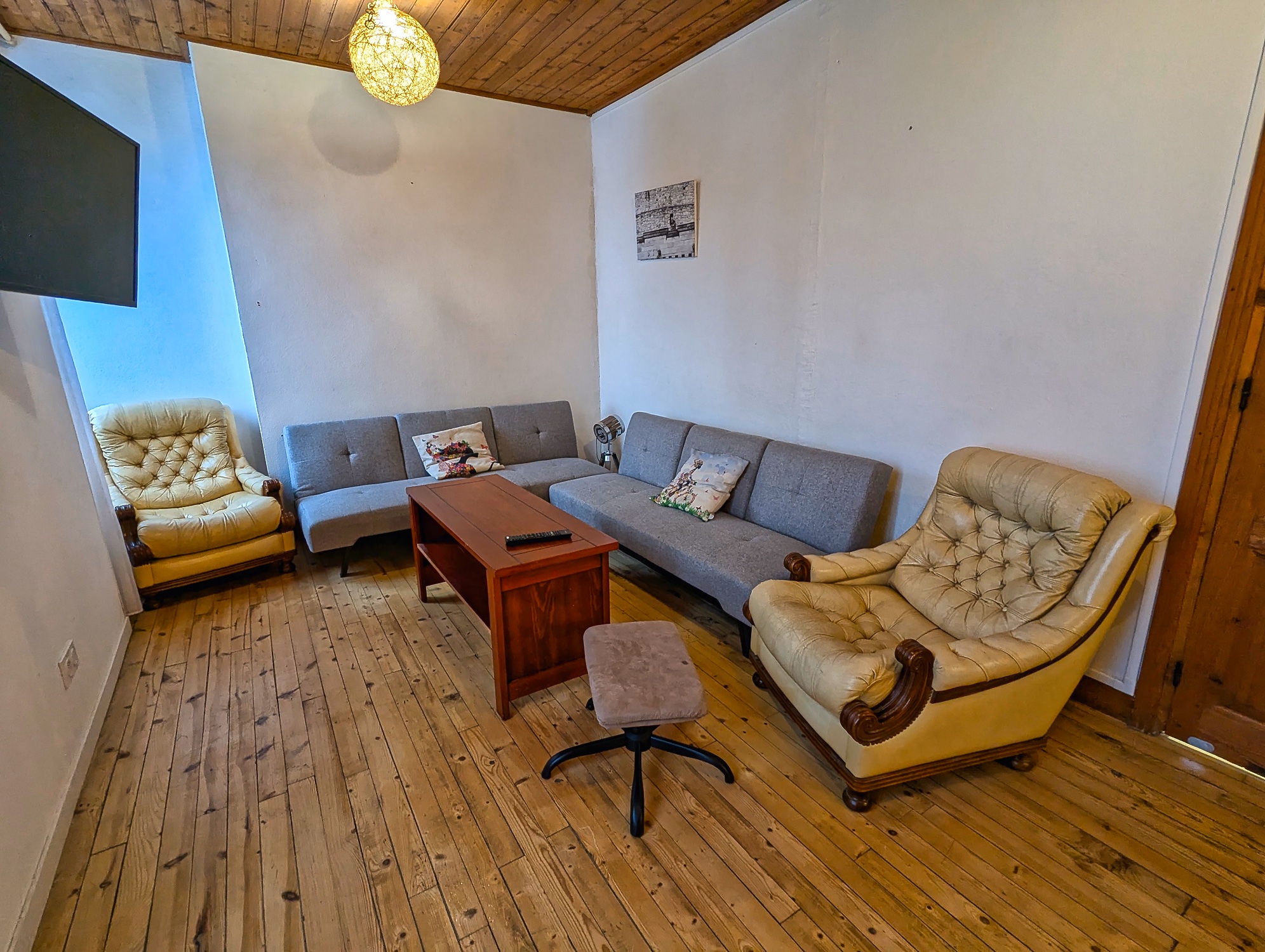- au bout du couloir qui dessert les différentes pièces, est situé le salon avec écran plat au mur avec Netflix . Un grand canapé 3m20x1m20, une table basse et un fauteuil meublent cette pièce