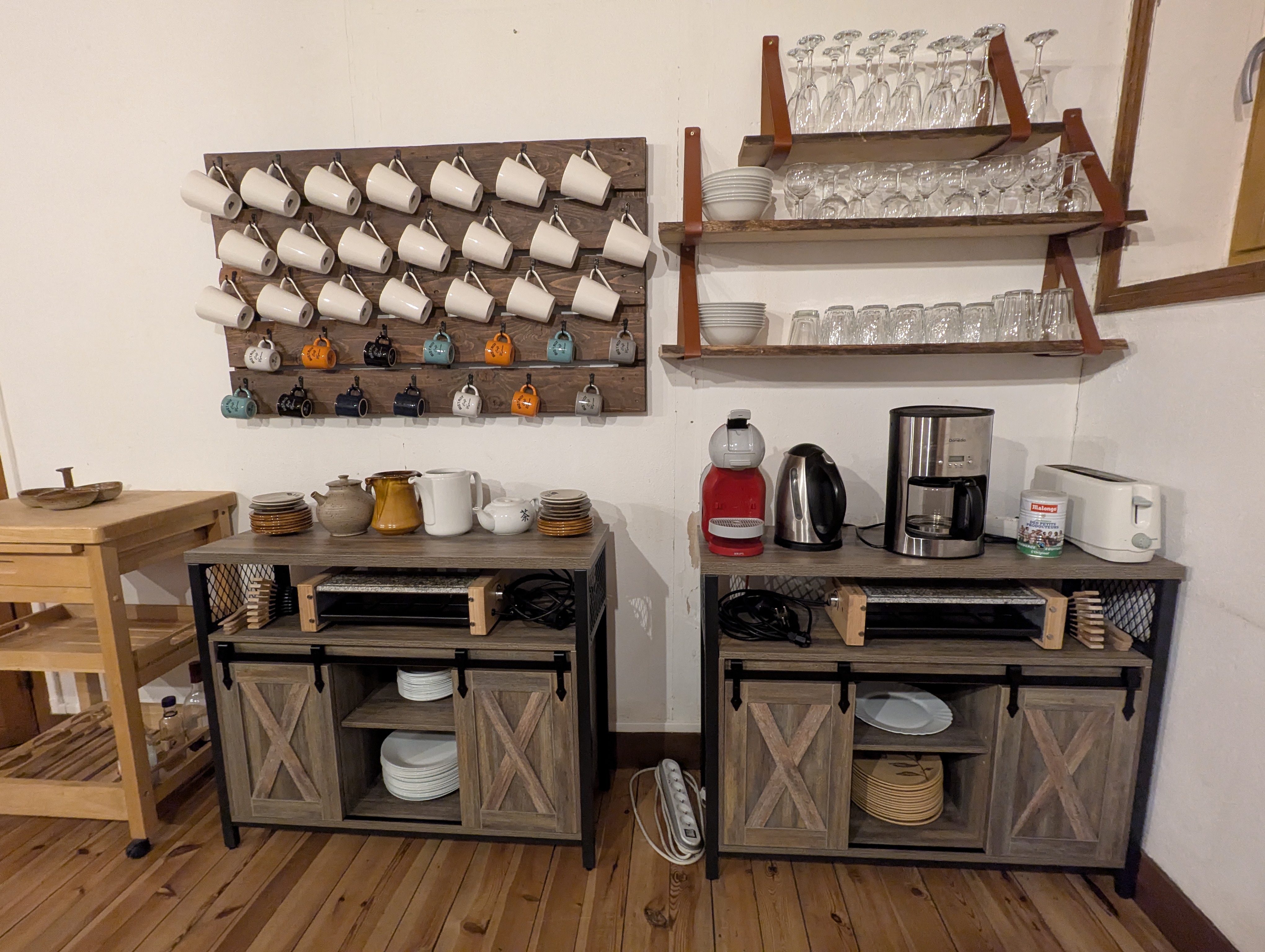 - une à salle à manger de 35m2 avec 2 tables en bois massif, une télévision écran plat, une partie petit déjeuner avec cafetières ( filtre & capsule),bouilloire, grille pain, le présentoir à mug et une desserte. 2 jeux de nappes fournies